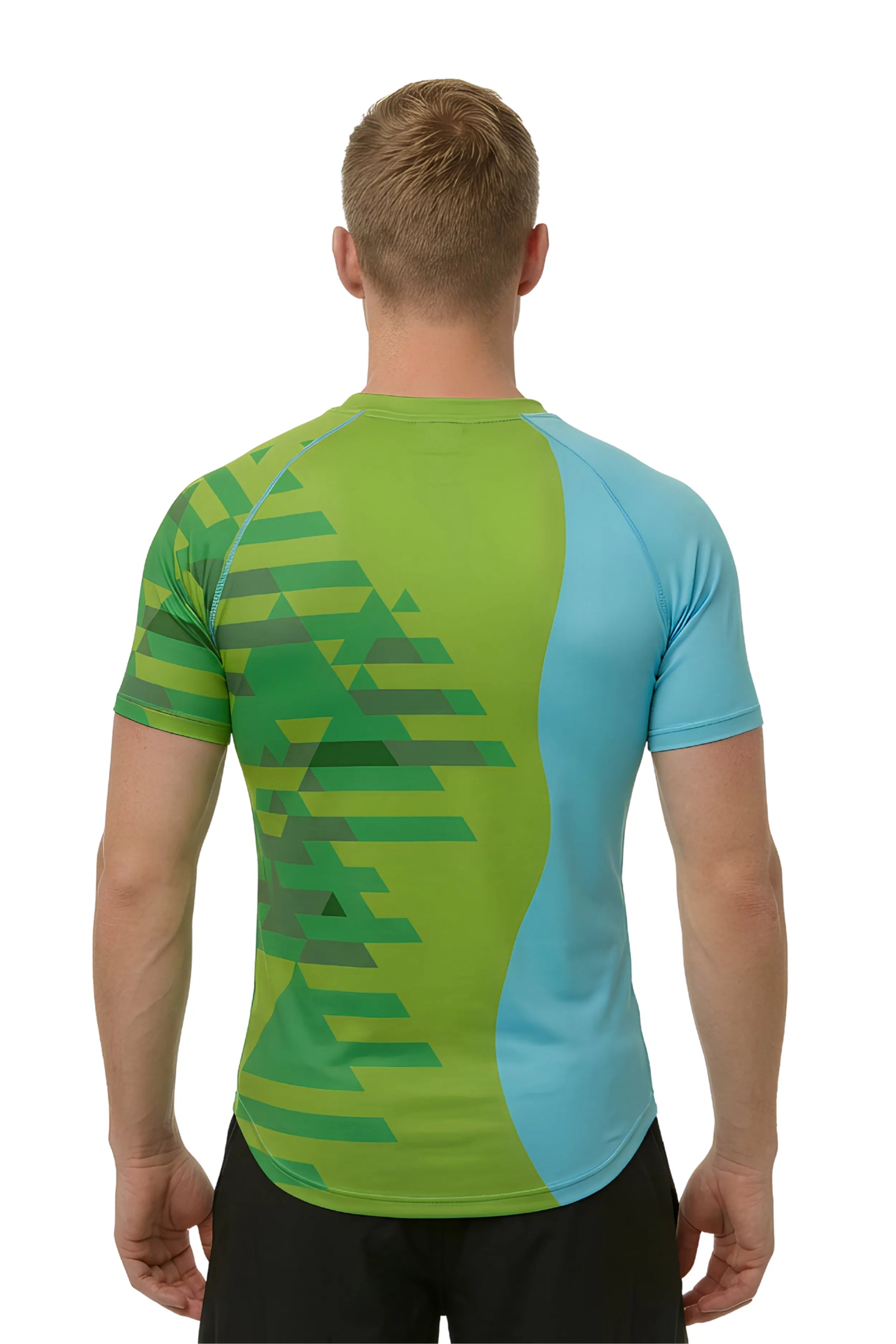 Capture the spirit of the legendary Gorge Downwind Champs with this striking men’s rashguard edition. The design features layered triangular patterns in rich forest greens, evoking the majestic evergreen-covered cliffs and cascading terrain of Stevenson's iconic landscape. A complementary aqua blue colorblock represents the powerful Columbia River, creating a modern angular pattern that mirrors the dynamic wind conditions world-renowned among paddlers and water sports athletes.